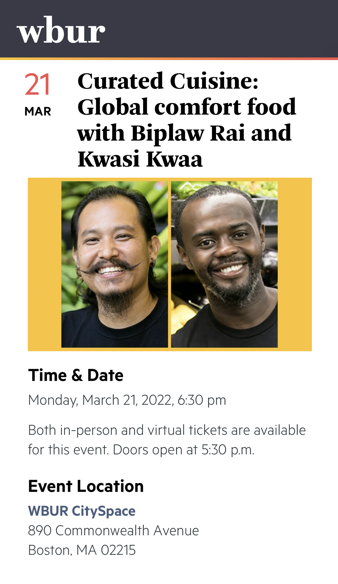 Join us for a conversation with Biplaw Rai and Kwasi Kwaa, managing partner and chef partner of Comfort Kitchen, a restaurant celebrating the flavors and ingredients of the African diaspora, set to open in Boston later this year. Irene Li, co-founder of the Mei Mei Restaurant Group, moderates.